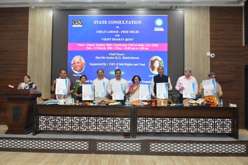 नई दिल्ली, 16 मार्च। राष्ट्रीय राजधानी में बाल श्रम की वर्तमान स्थिति की समीक्षा, रोकथाम, बचाव और पुनर्वास के लिए बेहतर समन्वय के रास्ते तलाशने के उद्देश्य से “बाल श्रम मुक्त दिल्ली की ओर” विषय पर एक राज्य स्तरीय परामर्श बैठक आयोजित की गई। इस बैठक में सरकार के प्रतिनिधि, बाल संरक्षण संस्थानों, नागरिक समाज संगठनों तथा नीति विशेषज्ञों ने भाग लिया। बैठक पहल संगठन द्वारा आयोजित की गई। इसमें क्राई (चाइल्ड राइट्स एंड यू) और फारेस्टर ज्ञान साझेदार के रूप में शामिल रहे। कांस्टीट्यूशन क्लब आफ इंडिया, नई दिल्ली में आयोजित इस कार्यक्रम में भारत के पूर्व मुख्य न्यायाधीश और राष्ट्रीय मानवाधिकार आयोग के पूर्व अध्यक्ष न्यायमूर्ति के जी बालाकृष्णन ने संस्थागत जवाबदेही को मजबूत करने और बच्चों के अधिकारों व गरिमा की रक्षा के महत्व पर जोर दिया।